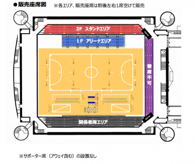チケットの販売エリアにつきましては、1F アリーナ席および2F スタンド席のみとなります。2F ゴール裏席および関係者席への着席はできません。