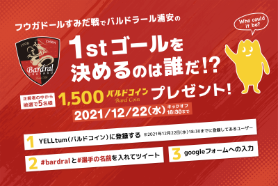 12月22日(水)今年最後のホームゲーム(vs. フウガドールすみだ)にて、「バルドコイン〜1stゴールは誰だ!?〜」 ゴール予想企画を開催いたします!正解者の中から抽選で5名様に1,500バルドコインをプレゼント!ぜひ予想いただき、バルドコインをGETしてください!!