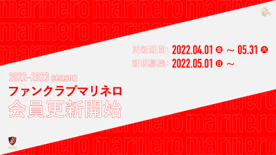 2021-2022シーズン「マリネロ」レギュラー会員にご入会の方につきましては、新シーズンに向けて会員様本人による更新が必須となります。2022-2023シーズンマリネロ会員への更新をご希望の方につきましては、4/1(金)〜5/31(火)までにファンクラブ「マリネロ」サイトよりお手続きをお願いいたします。