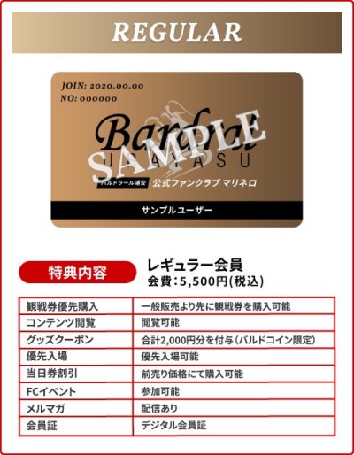 2022-2023シーズンレギュラー会員にご入会いただくと、ホームゲーム観戦チケットが一般販売よりも早く購入可能!さらにホームゲーム会場で使用できるグッズ割引クーポン(2,000円相当)が付いてくる!また、日々の練習風景動画や、オフィシャルカメラマンが撮影した試合写真を掲載したバルギャラリーも閲覧可能です!