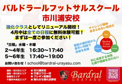 2022年4月より「バルドラールフットサルスクール市川浦安校」は、クラス改正を行い新規開校をいたします。