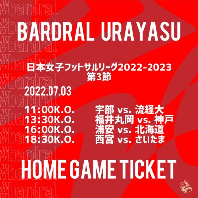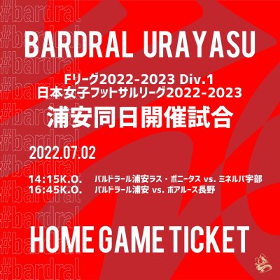 7月2日(土)Fリーグ/WFリーグ浦安同日開催試合、7月3日(日)WFリーグ浦安セントラル開催試合の観戦チケットの販売につきましては、チケットペイでの前売り販売および、試合会場での当日券販売とさせていただきます。