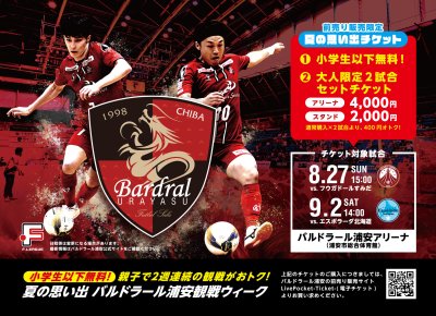 8月27日(日)、9月2日(土)にバルドラール浦安アリーナにて開催されます、Fリーグ2023-2024 ディビジョン1第10節(すみだ戦)、第13節(北海道戦)は2週連続のホームゲームです!そこでバルドラール浦安では、親子やご家族で、「夏の思い出」を作っていただくために、おトクな観戦チケットをご用意いたしました!!