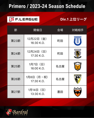 12月9日(土)、10日(日)に開催しましたFリーグ2023-2024 ディビジョン1 第22節の試合結果において、レギュラーシーズン上位6チーム・下位6チームが決定いたしました。これにより、12月22日(金)より開催する、ファイナルシーズンの対戦カードが決定いたしましたので、以下のとおりお知らせいたします。