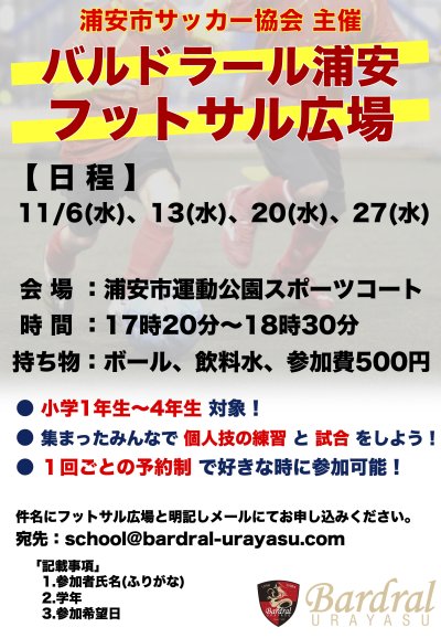 バルドラール浦安フットサル広場は、1回ごとの事前申し込み制で気軽に参加出来るワンコインスクールです。