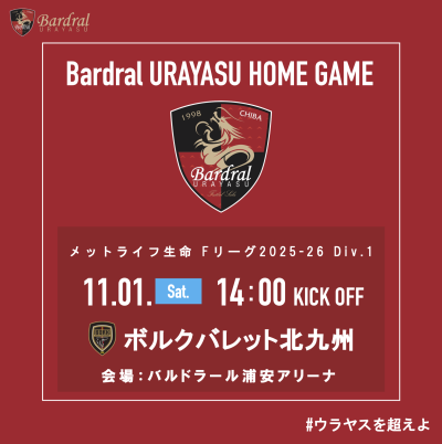 メットライフ生命Fリーグ2025-26 ディビジョン1は、14試合が終了し、バルドラール浦安は6勝1分7敗の6位。今節ホームに迎えるは現在リーグ10位につけるボルクバレット北九州。上位へ這い上がるためにもここからが正念場。それぞれの想いを胸にバルドラール浦安アリーナでともに闘おう!