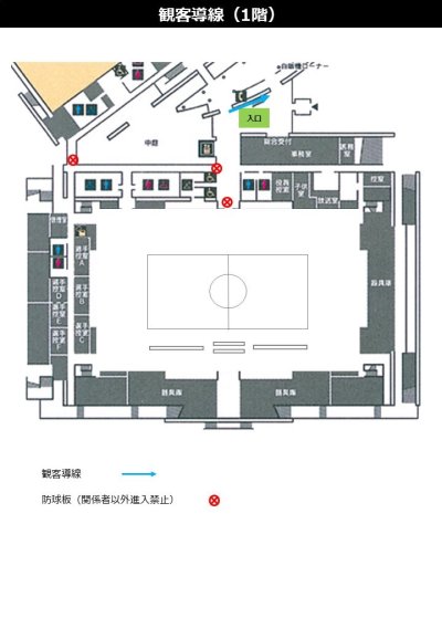 ※下記画像の観客導線の通り、体育館1階の入口より入館して階段を上り2階観客席にお進みください。(1階入口で室内履きに履き替えてください)