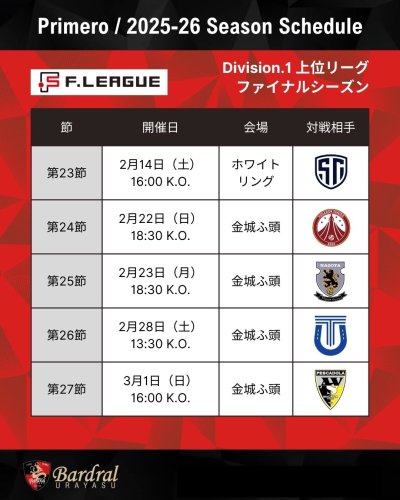 この度、2月14日(土)より開催されます、メットライフ生命Fリーグ2025-26 ディビジョン1 ファイナルシーズンの試合日程およびキックオフ時間が下記の通り、決定しましたのでお知らせいたします。ファイナルシーズン上位リーグもバルドラール浦安への熱いご声援を引き続きよろしくお願いいたします。