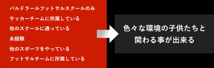 バルドラールフットサルスクールでは、「Spirit」「Intelligence」「Family」という3つの育成方針に基づき子供たちへアプローチしていきます。この方針の基、バルドラール浦安のトップチームで戦える選手、そして世界で活躍出来るフットボール選手の育成を目指し、また、一人の人間としても大きく成長出来るよう育てていきます。